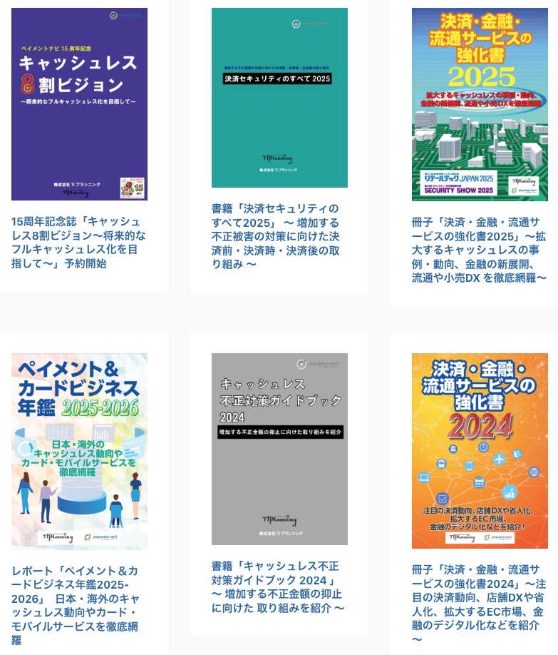 キャッシュレス・決済業界の実務知識を体系的にまとめた書籍やレポートを発行しています。『ペイメント&カードビジネス年鑑』をはじめ、国内外の決済動向、セキュリティ対策、ポイント施策などを網羅。最新の市場分析と事例を通じて、企業の決済戦略やサービス企画に役立つ情報を提供しています。